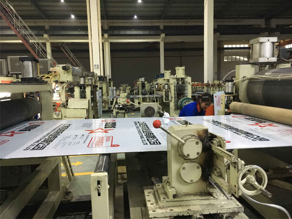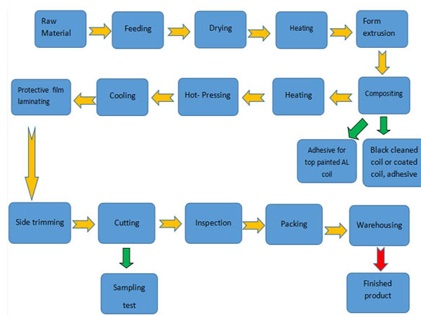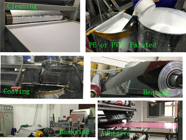 Трехслойный соэкструдированный лист со структурой адгезива должен быть изготовлен поэтапно, а затем объединен с верхним и нижним алюминиевыми листами. Имеется толщина 0,15 мм с алюминиевой панелью с обеих сторон, и 3 ~ 5 мм в основном слое, общая толщина 4 ~ 6 мм. Наконец, вся панель нарезается на 1220x2440 мм.